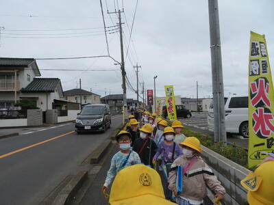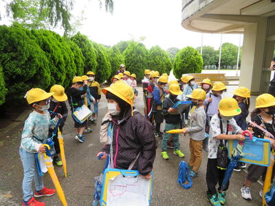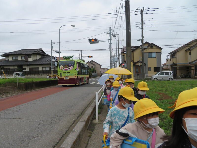 6月7日、梅雨空の曇天下、2年生が学校外、学区の様子を見に出かけました。