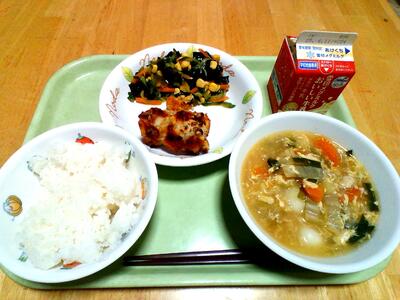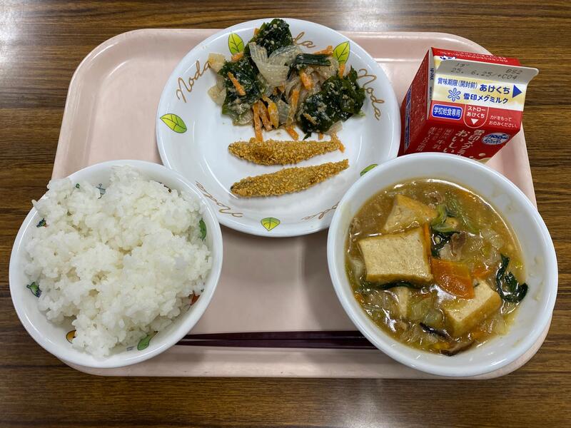 <メニュー> ご飯、牛乳、鶏肉のスタミナ焼き、高野豆腐の煮物、お麩の味噌汁