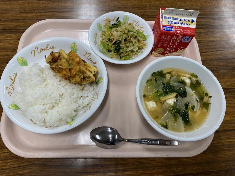 <メニュー> かみかみかき揚げ丼、牛乳、野菜のたくあん和え、大根の味噌汁
