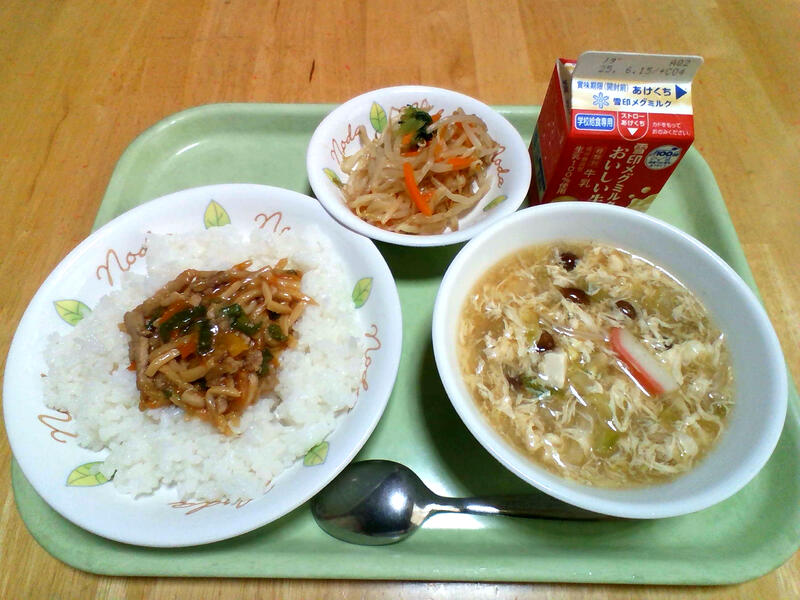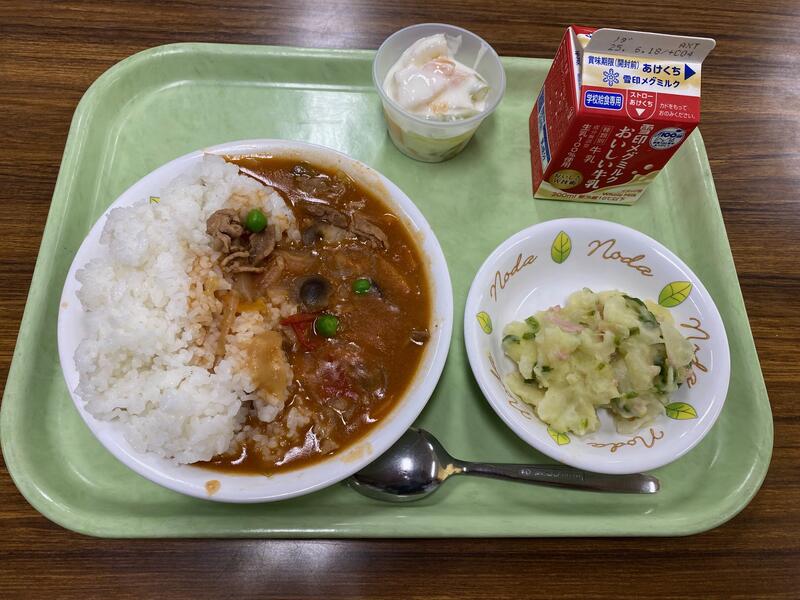 今日はハヤシライスです。ちなみに昨日の給食はチンジャオロースでした。上の写真は昨日(6/4)の給食です。下の写真が本日(6/5)の給食です。