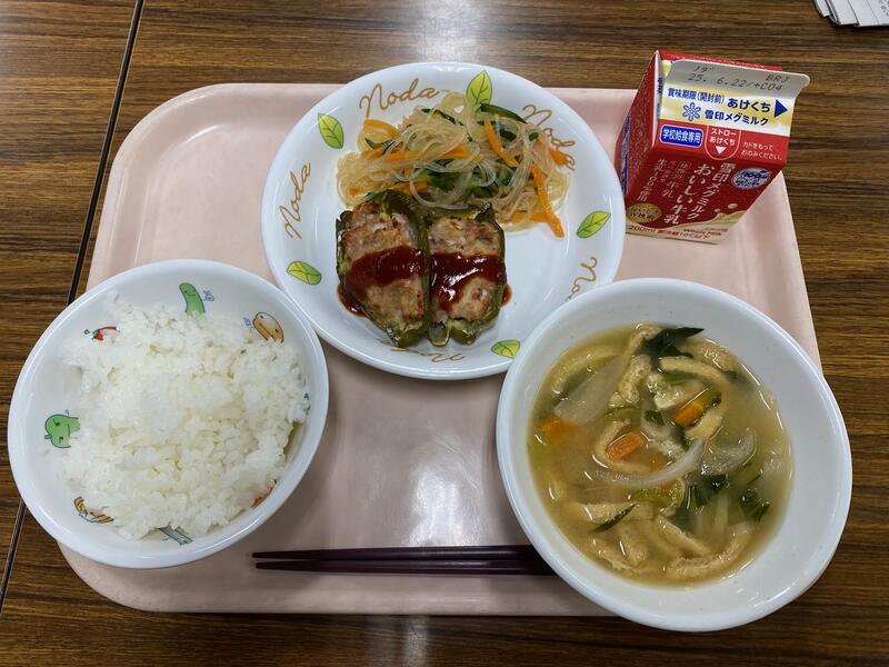 <メニュー> ご飯、牛乳、ピーマンの肉詰め、春雨サラダ、玉ねぎと油揚げの味噌汁