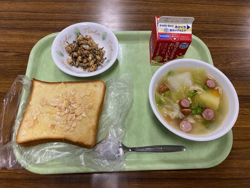 <メニュー> アーモンドトースト、牛乳、ポトフ、まめ小魚