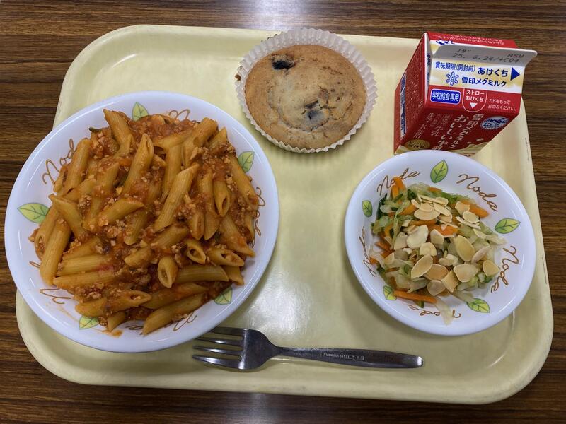<メニュー> ペンネボロネーゼ、牛乳、キャベツとナッツのサラダ、ブルーベリーパンケーキ