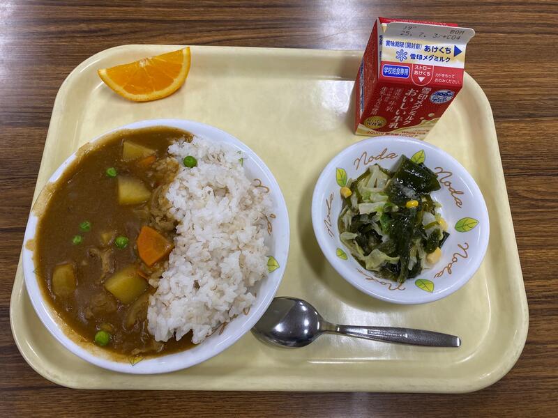 <メニュー> 麦ご飯、牛乳、尾崎小カレー、海藻サラダ、オレンジ