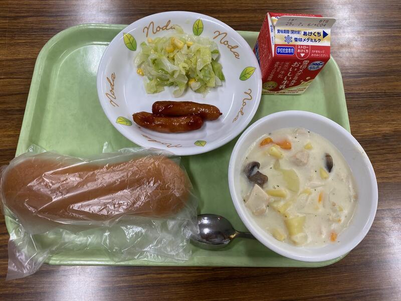 <メニュー> セルフウインナーサンド、牛乳、キャベツのサラダ、マカロニクリーム煮