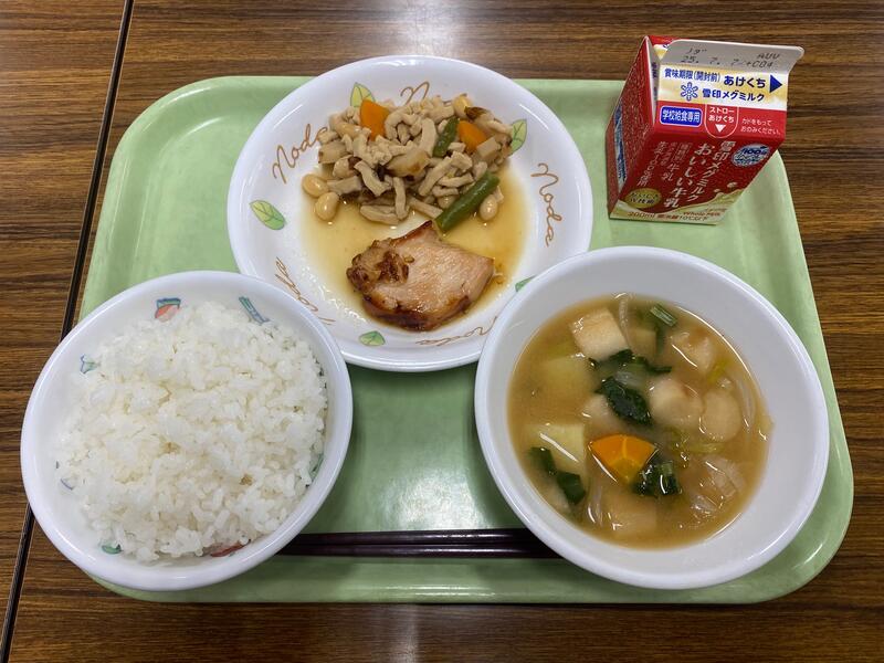 <メニュー> ご飯、牛乳、鶏肉のスタミナ焼き、高野豆腐の煮物、お麩の味噌汁