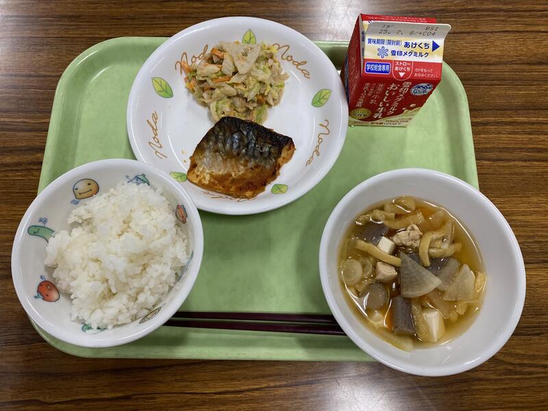 <メニュー> ご飯、牛乳、鯖のネギ味噌焼き、白菜のゴマ酢サラダ、けんちん汁