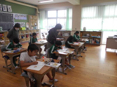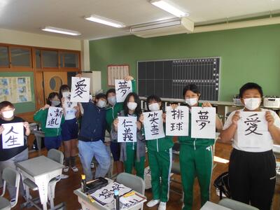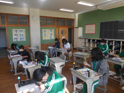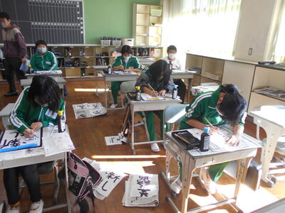 6年生は書写の学習を行いました。今日は小学校生活で習ったことを生かして自分の好きな言葉を書きました。お手本がなくても、「とめ」「はね」「はらい」などを意識して書けました。