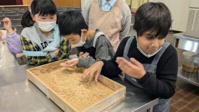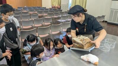 工場見学終了後は、体験活動です。せんべい体験を通して醤油をしぼったり塗ったりしました。焼きたてのせんべいに醤油を自分で塗っておいしくいただきました。