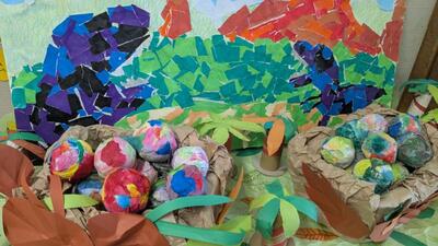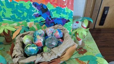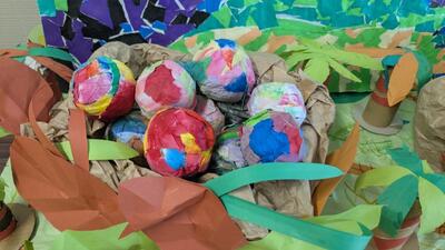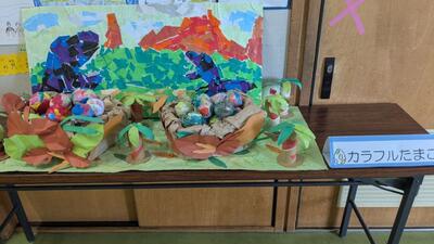 あおぞら学級では作品展に向けてみんなで作品をつくりました。恐竜をきり絵で作成して、たまごをカラフルに作りました。雰囲気のある作品をぜひご覧ください。