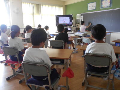 4年生は算数です。教員3人で子どもたちと授業をしています。たくさん手があがっていました。