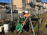 本日、関宿ビオトープの測量が行われました。中央工学校の先生方3名がおいでになり、専門的なやり方を教えていただいた後、実測。池ギリギリに柱を立て、角度を定めて距離を図り図面に写していく。30地点ほどを手分けして調べました。