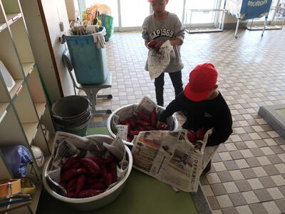 いよいよ明日、1・2年生で焼き芋大会を実施する予定です。本日は事前準備でお芋を洗いました。明日は天気がよく、風もない予報ですので、ホームページでご報告させていただきます。