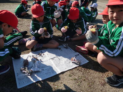 1・2年生、あおぞら教室さんでつくった「さつまいも」が今年は大豊作でたくさん収穫することができました。そのおいもを本日焼き芋でたべました。しっかりとお芋を洗い、ぬれた新聞紙でくるんだ後アルミホイルで巻き、怖がりながらお芋をたき火の中に入れました。お芋はとてもよく焼けていて、おいしくみんなで食べることができました。