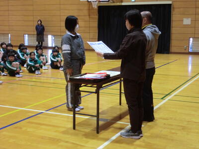 本日は全校集会で、「あおいそら運動実践文・善行賞」、消防ポスターの表彰を行いました。その後、教頭先生からよい1年の締めくくりをし、来年につなげてほしいと伝えていました。最後に元気のよい校歌が聞けてとてもよかったです。もうすぐ、1年が終わろうとしています。それぞれで、次の一年につながるよう、しっかりと振り返ってほしいと思います。