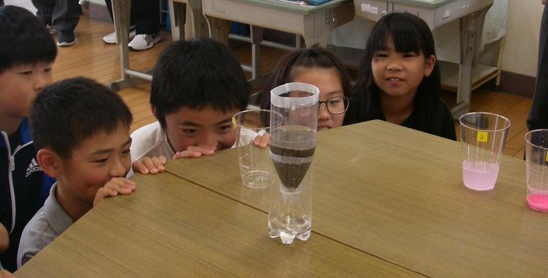 今度は砂を使った濾過(ろか)装置に水を通してみました。