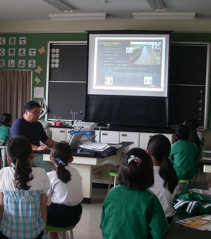 6月26日、27日に東葛北部土地改良区の方々による田んぼの生き物調査の授業が行われます。最初に理科室で、生き物調査のねらいや、生き物の見分け方などをスライドを使って勉強しました。