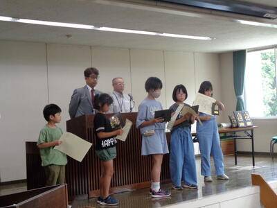 本日、健歯コンクール・健歯ポスター表彰式に4名の児童が出席しました。健歯コンクールの本校代表として、6年の玉木さん、ハーンさんが出席し、健歯ポスターでは、優秀賞を受賞した5年生の押山さん、2年生の富澤さんが出席しました。優秀賞は野田で2番目によい賞でなかなか取ることが出来ません。押山さん、富澤さん、誠におめでとうございます。なお、野田市役所ふれあいギャラリーに6月26日(水)13時から7月2日(火)14時まで、学校代表の6名の作品が展示されます。
