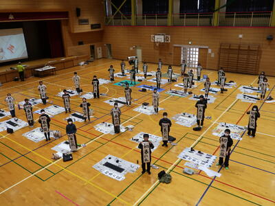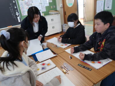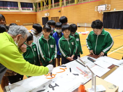 本日、書道の講師として坪谷先生をお招きして、書き初め練習会を実施しました。3年生は「手まり」、4年生は「うめの花」、5年生は「新しい年」、6年生は「初春の風」をお題に練習を進めました。うまく書くポイントを押さえたご指導をしていただき、ものすごく上達しました。