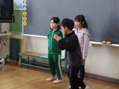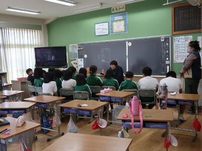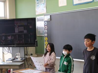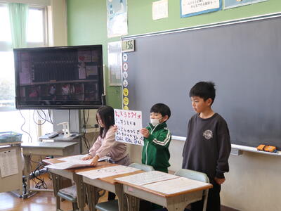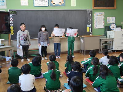 本日、2年生が11月に行った町探検で学んできたことを1年生に発表しました。2年生は今まで練習した成果を発揮し、大きな声で立派に発表しました。「劇」を用いたグループ、「クイズ」形式のグループ、「紙芝居」を用いたグループがあり、どれも工夫があった発表をしていました。こちらは1月の授業参観でも発表しますので、是非保護者の皆様は参加してほしいと思います。