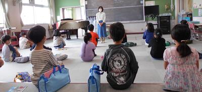 音楽の授業も始まりました。本校では、音楽室は机やいすを使いません。間隔を開けて座ります。もちろん、歌うことやリコーダー鍵盤ハーモニカも出来ませんので、このときは、今月の歌を聴いて、歌詞を想像する学習をしていました。今月の歌は「線路は続くよどこまでも」。最初のイントロは汽車の汽笛。でも、見たことも乗ったこともない子どもたちには難しかったようです。「のをこえやまこえたにこえて」野、山、谷……歌詞をヒントにイメージを拡げました。情景が浮かんでから歌を聴くとさっきよりも楽しくなりました。体を動かしながら聴く子どもたちです。