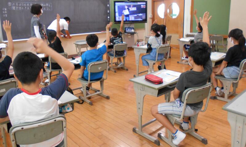 となりの学習ルームでは、大型テレビにその様子が映し出されています。四方先生が画面の向こうから「発表してください」と言うと一斉に手が上がりました。四方先生はWEBカメラで映し出されたその様子を確認しながら指名をしています。
