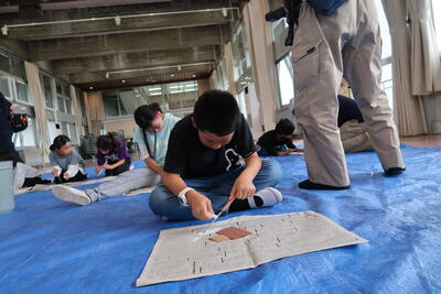 糸のこぎりの機械の使い方を教えてもらっています。危険を伴う作業でもありますので皆さんしっかりと聞いています。