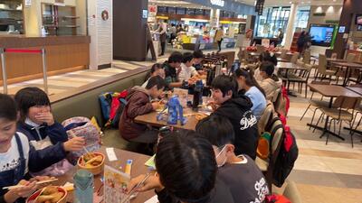 昼食中(守谷SAにて)みんな楽しそうに食べています。
