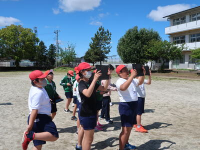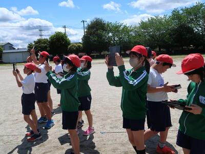 5年生が理科の授業で「雲」の様子をタブレットを用いて観察していました。撮った画像を加工し、自分でレポートを作成するようです。