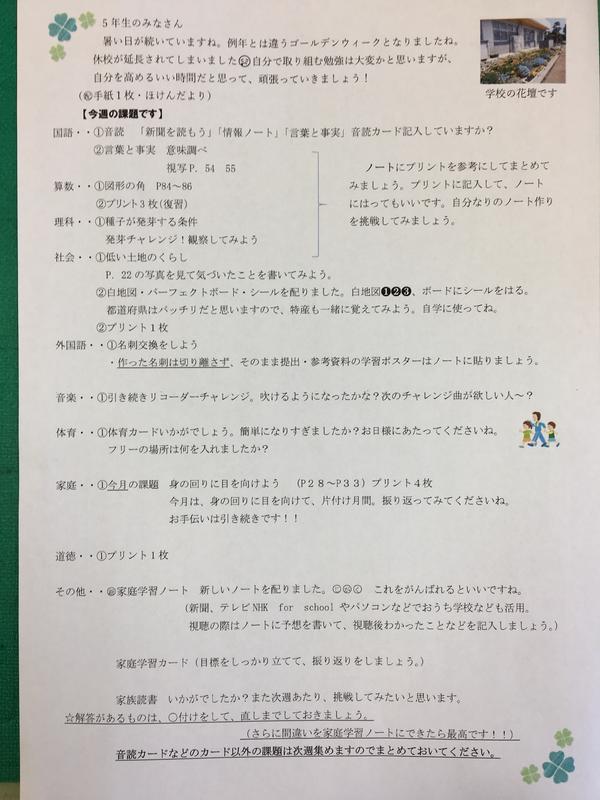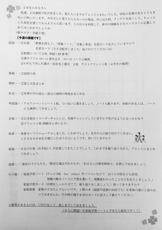 これまで、毎朝、吉野先生が「おきていますか?」と電話をしてきました。ちゃんと電話に出てお返事をしてくれてありがとう。規則正しく生活をする準備は出来ましたか?少しずつ日常の学校生活に慣れてきたら、今度は、高学年として、低学年のお友だちの見守りなどをよろしくお願いします。