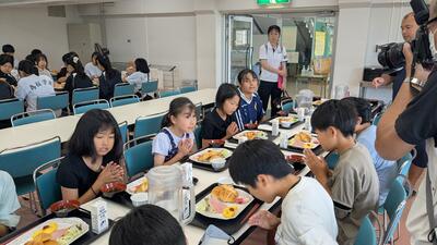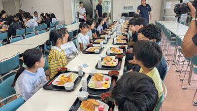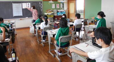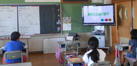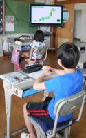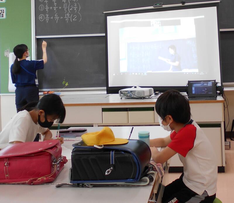 5年生は教室と家庭科室に分かれて学習を進めました。家庭科室では、吉野先生が話す声をしっかりと聞いて学習を進めています。板書の手伝いをしてくれているのは3年生の鈴木先生です。教室での学習とタイムラグが生じることのないように、丁寧に連携をして進めました。