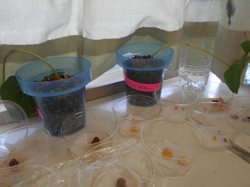 「発芽に必要なのは何か?」です。みんなの予想は、光、水、ちょうどいい温度、土…………。ひょろひょろインゲンになったり、残念ながら発芽しなかったり、実験を通していろいろなことがわかりました。