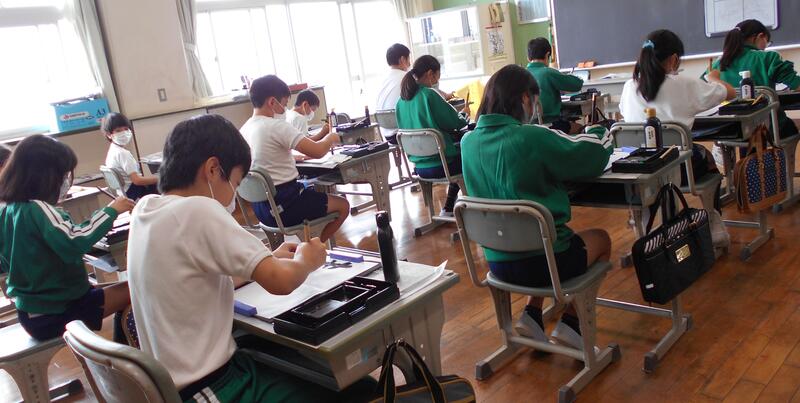 教頭先生の書写の授業です。1回目に書いた文字を残しておいて、どこが自分の課題かを考えながら次週取り組んでいきましょうということになりました。5年生の皆さんの集中している姿、とても美しいです!!