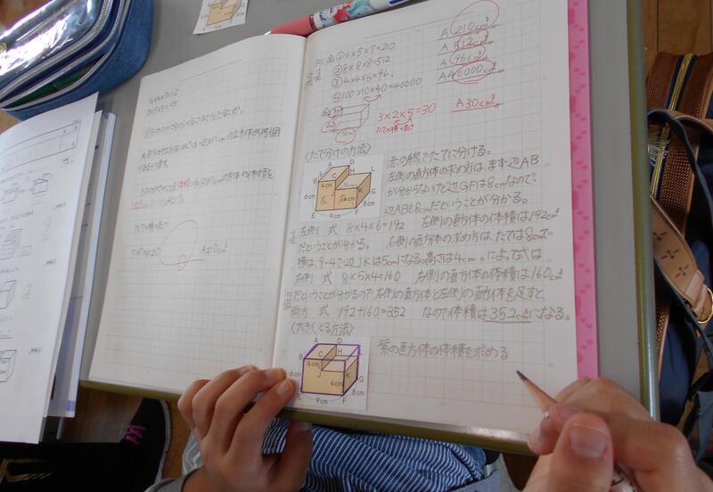 算数の時間のノートを見てびっくり! びっしりと自分の考えが書かれています。複雑な立体の体積をどうやって求めたらいいか、一つの考えではなく、いろいろな方法で出来ること、どんな考え方でも、きちんと体積は同じになることを確かめています。5年生になるとこんなに自分の考えを書けるようになるのですね。