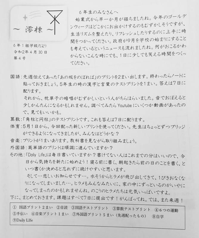最後の分散登校の週は、6年教室と図書室に分かれて学習をしました。一週間、A,Bに分かれていましたが、理科のジャガイモ畑に行くとき、一瞬全員がそろう機会がありました。「密にならないで」と声をかけながら、みんなとても嬉しそうでした。
