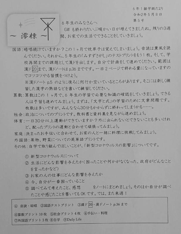 そんな6年生ですが、小さな1年生に何をしてあげられるか考えているようです。来週から一斉登校となります。6年生一人ひとりが様々な場面で輝きを見せてくれることを楽しみにしています。