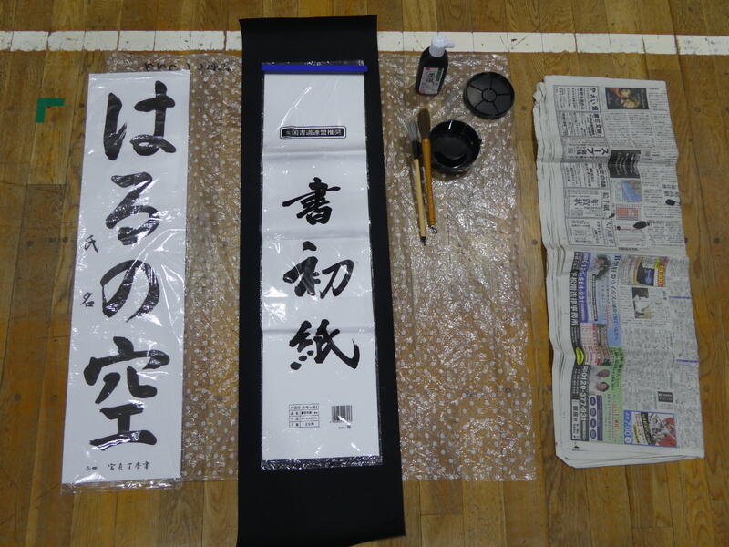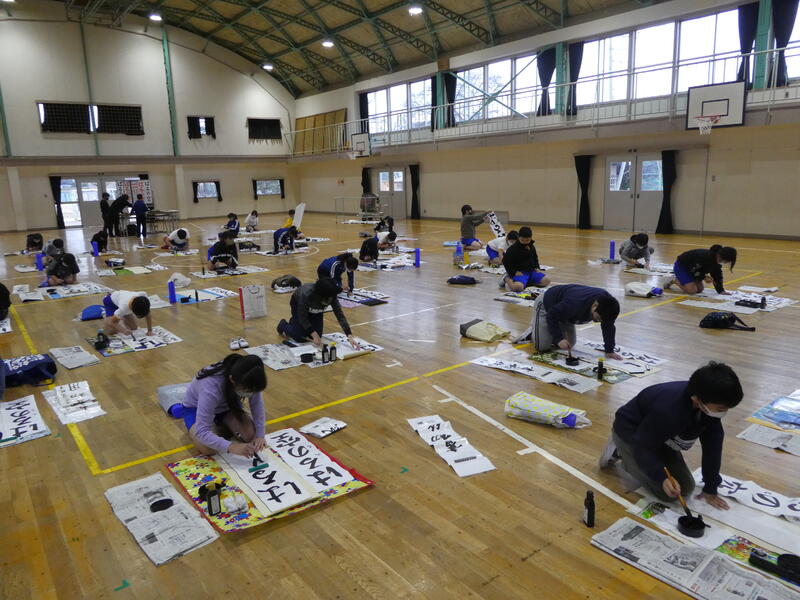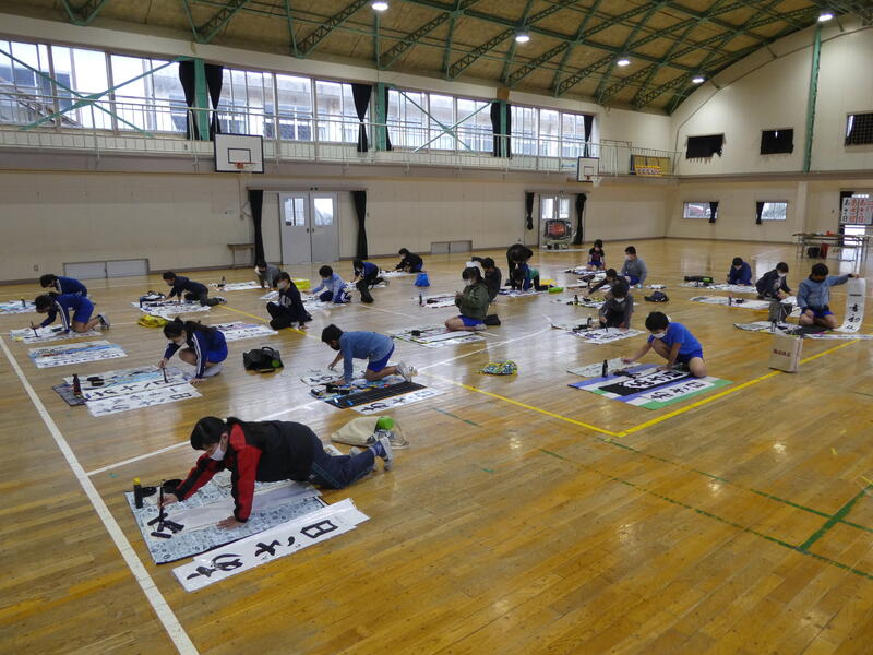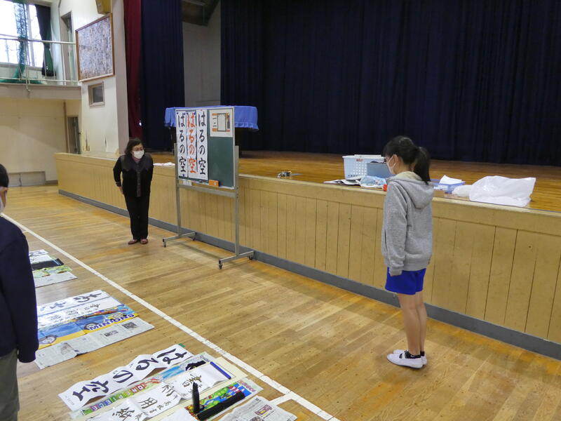 体育館では、窓を開け、距離をとって実施しました。コロナ対策として、市教育委員会から配置いただいた大型ファンを2台を活用して、風を送り、換気に留意しました。