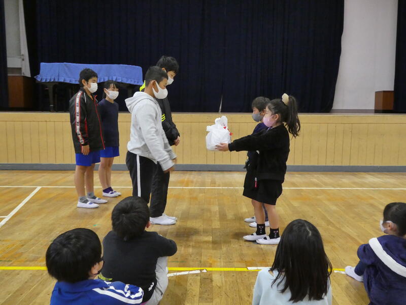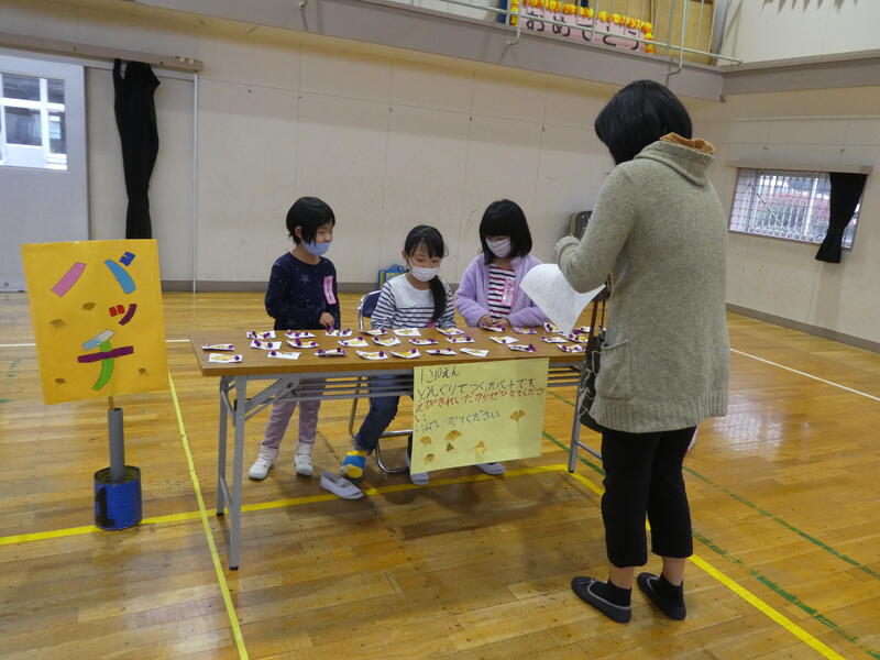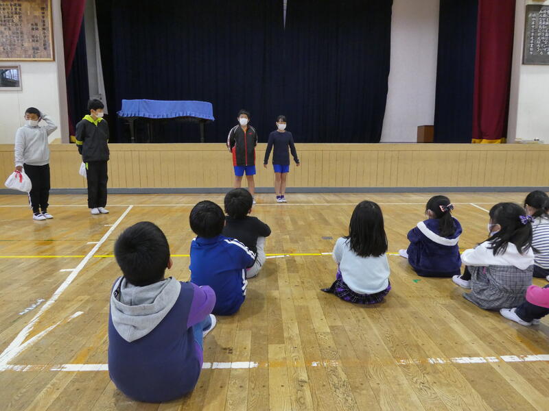 次に「いちょぴーじゃんけん」児童会のお友だちが、グー・チョキ・パーのいちょぴーバージョンを教えてくれたので、そのとおり、楽しく実施しました。