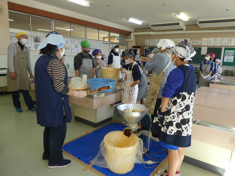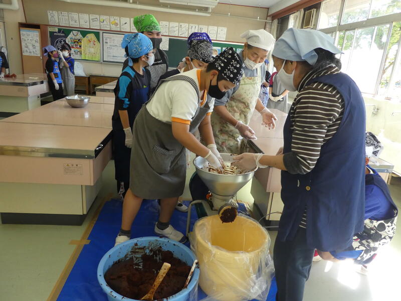 3年生の時にみんなで作ってた味噌。ひっくり返して、よく混ぜることで、更に香り高いおいしい味噌へと変身します。皆一生懸命取り組みました。