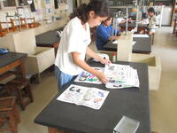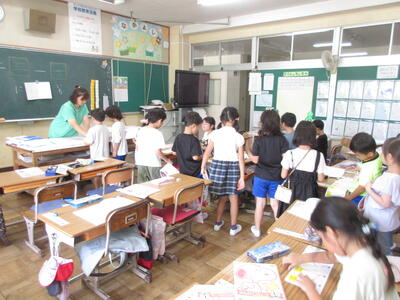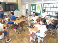 5年生が英語の学習で、「What do you have in your town?」というセンテンスを使って会話をしました。