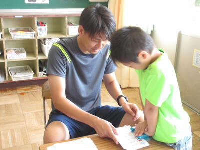校長室では、「hospital」のカードを預かり、やり取りが成立したらそのカードをもらえる、というゲーム形式のレッスンです。