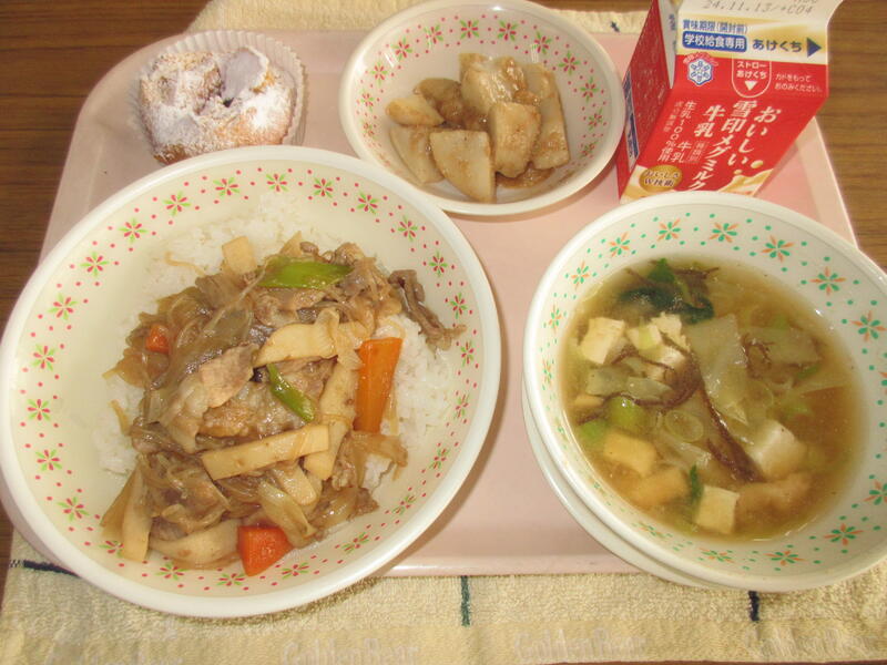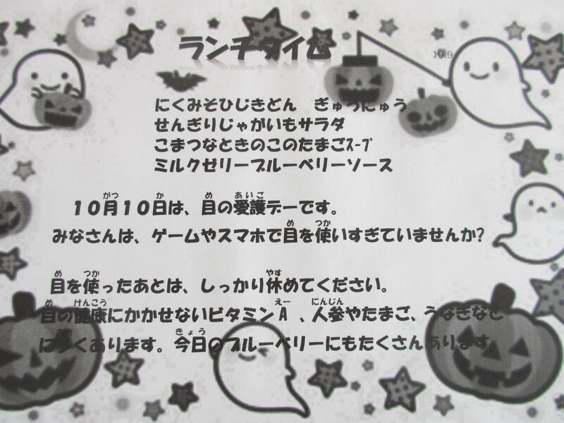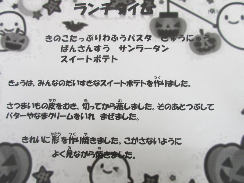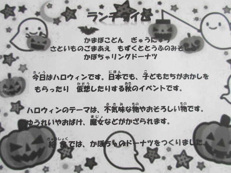 今日は、ハロウィン。カボチャのリングドーナツが出ました。季節感たっぷりの給食です。11月も楽しみにしています。ごちそうさまでした。