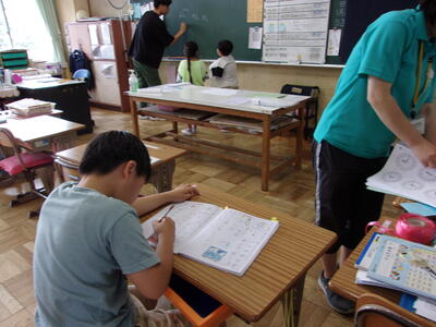 6年生は、英語のテスト中。四線にきちんとアルファベットを書くよう、担任の先生からアドバイスがありました。