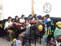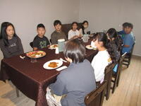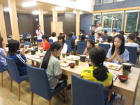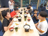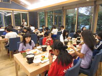 お客様は、活発な4年生と一緒に、ランチルームで食事をしました。