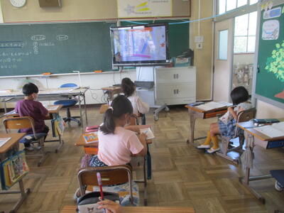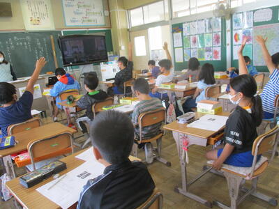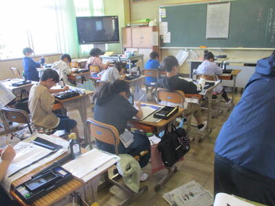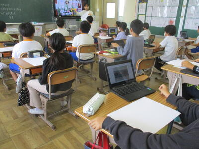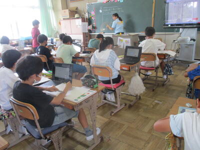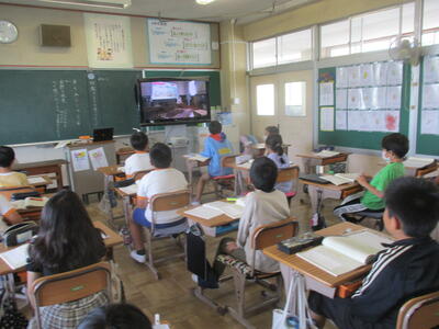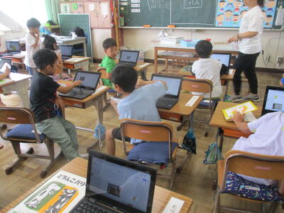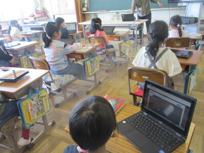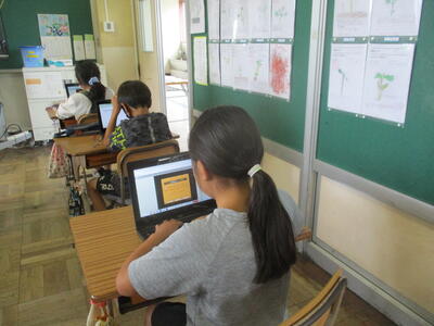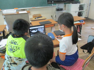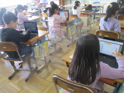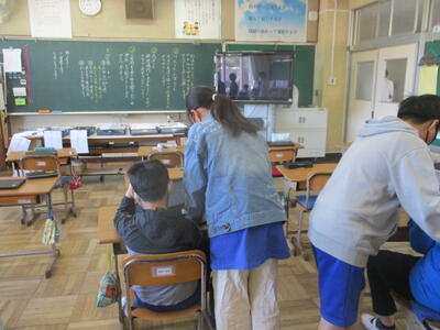 4年生 クロームブックで「折り鶴」の作り方を確認中!
