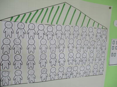 5年1組 クラスの力を結集させて家庭学習ノートの「タワー」を築いています。
