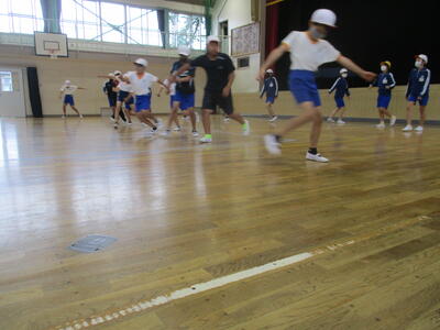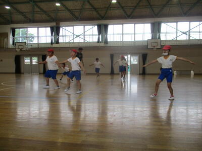 4年生 体育館 「祝う会」の練習。 内容は内緒です。