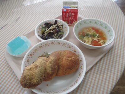今日のメニューは「きなこ揚げパン」「もやしとキクラゲのサラダ」