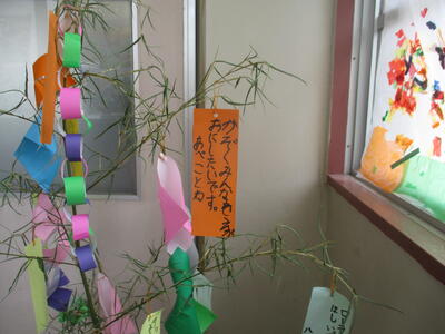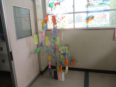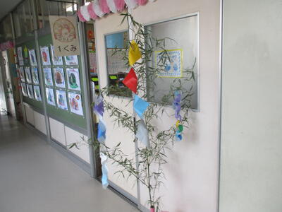 教室前には「笹」が立ちました。 願い事、楽しみです。