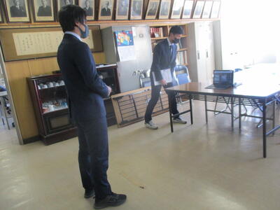 おッ! 6年生 1年生の教室から机や椅子を持って移動中。